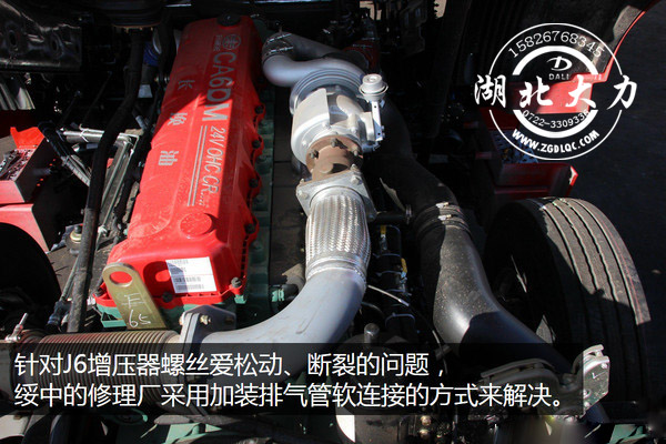 綏中以散戶車輛為主,在提車之后都會根據(jù)自己的使用需要進行相應(yīng)的改裝。針對J6增壓器螺絲愛松動的問題,綏中的修理廠采取排氣管軟連接的方式來緩解震動,改裝后,增壓器螺絲松動甚至斷裂的情況基本杜絕。像加裝變速箱吊架,加裝尿素保護罩,電瓶防護架等在當?shù)匾残纬闪烁难b特色。