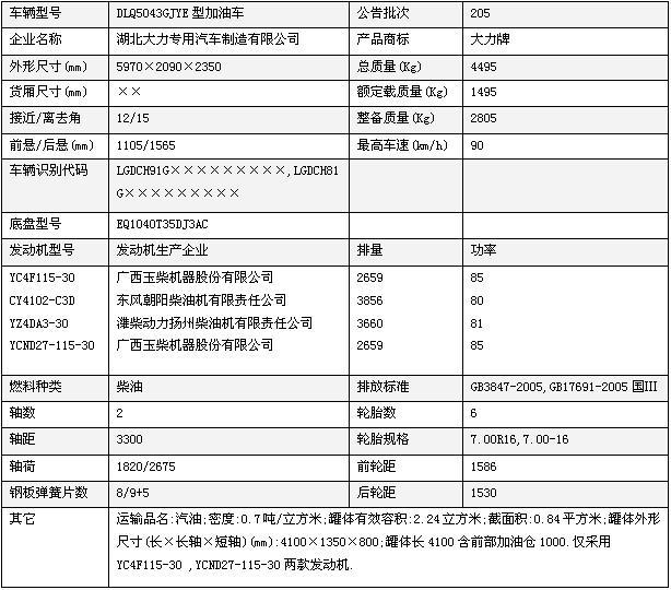 東風(fēng)輕卡系列加油車有,東風(fēng)小霸王,東風(fēng)福瑞卡,東風(fēng)多利卡等,按公告尺寸罐體容積可達(dá)6.3立方,朝柴96馬力,2.2噸前橋,后橋3噸,氣剎,軸距:3300,歐二底盤,改國三手續(xù),7.00輪胎,整車價(jià)格:6.95萬元(含稅控加油機(jī)及15米加油管)。