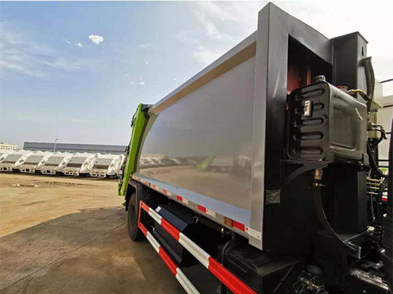 1、產(chǎn)品結(jié)構(gòu)介紹A、箱體結(jié)構(gòu) 垃圾箱采用加強(qiáng)梁和高強(qiáng)度鋼板焊接而成牢固的框架結(jié)構(gòu),側(cè)面采用縱向無拼焊工藝的整板制作,側(cè)板上下加強(qiáng)梁與側(cè)板整體成型,采用專用設(shè)備冷彎成型,大R角成型,提高了剛性,側(cè)板縱向無焊縫,有效避免了傳統(tǒng)拼焊工藝長時(shí)間使用造成的焊縫疲勞失效等缺陷,頂面為圓弧曲面,箱體底板與箱體側(cè)板采用先進(jìn)的拼焊工藝,避免了傳統(tǒng)焊接工藝長期使用造成箱體漏水的現(xiàn)象,箱體前下部設(shè)置有大容量污水收集箱,提高了車輛污水儲(chǔ)存能力,整體箱體外形美觀,重量輕,受力好,不易變形。