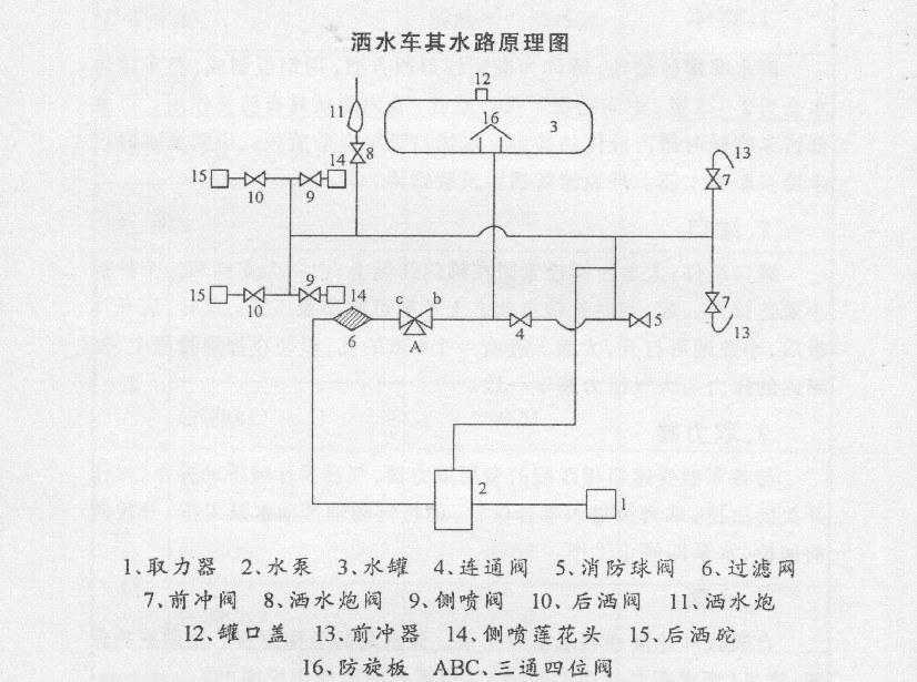 (4)作消防用:灑水車也通過本車水泵和消防接口作為應(yīng)急消防用,其操作程序是在消防接口接消防設(shè)備,打開消防接口球閥,關(guān)閉球閥1和2,關(guān)閉其他灑水噴頭,將四位三通閥的標(biāo)記擰到B位置,使 A-C相通,拉動取力器開關(guān),使水泵開始工作,此時(shí)即可通過消防接口向外提供消防用水。停止工作時(shí)各開關(guān)回位。
