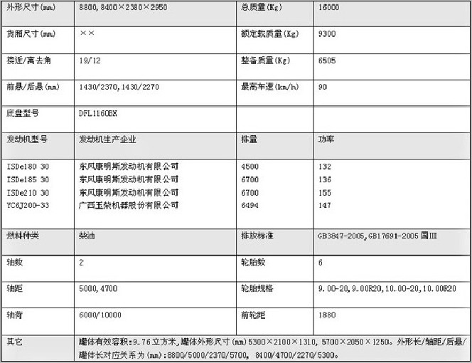 東風(fēng)天錦灑水車最常用底盤為DFL1160BX ,軸距為5米,其配置為:4×2驅(qū)動,D530平頭一排半平頂駕駛室, ISDe210 30電控共軌發(fā)動機,軸距5000mm,帶電加熱(預(yù)熱塞)冷起動裝置,全鋼160L燃油箱,電子油門踏板,消聲器排氣口向外(側(cè)吹),Φ395mm推式膜片彈簧離合器,東風(fēng)6檔DF6S900變速箱,頭檔速比6.938,最高檔為超速檔,6噸前橋,10噸后橋,主減速比5.571,無輪間差速鎖,部分功率(在變速箱上取力)取力器,車架斷面250×80×(7+4)mm,鋼板彈簧片數(shù)8/10+8,10.00-20斜交胎,自動調(diào)整臂,無ABS,半浮式駕駛室后懸,液壓機械翻轉(zhuǎn),無色夾層前風(fēng)窗玻璃,電動玻璃升降器,中控門鎖,通道式儀表板,帶空調(diào),有巡航系統(tǒng)。玉白。