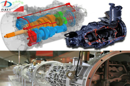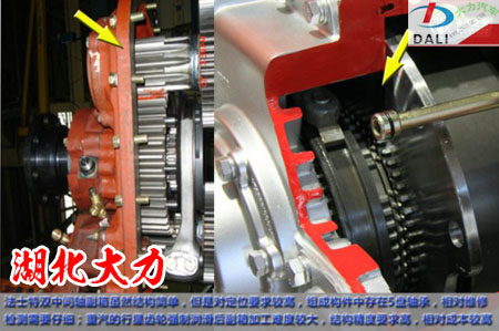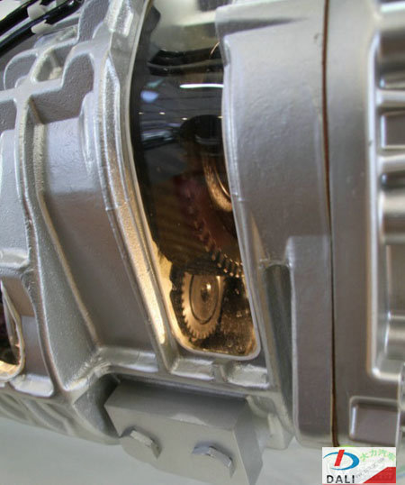 從結(jié)構(gòu)上看,法士特的雙中間軸變速箱基本上還是延續(xù)美國EATON的設(shè)計思路,但是在大扭矩變速箱上不裝強制潤滑油泵,尤其長時間爬坡以及高速重載下坡的情況下,在副箱上存在一定的不穩(wěn)定因素;可喜的是我們在北京車展上看到了類似油泵的設(shè)計,只不過并沒有運用在這次展出的AMT變速箱中,從驅(qū)動形式上看,此種比較像后副箱驅(qū)動類型。