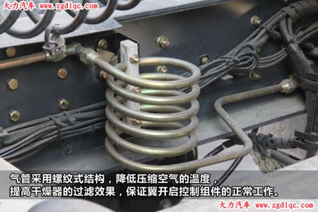 除了顏色,車身配置與之前常見的天龍沒有太大的差別,在大梁內(nèi)小編看到這么一個螺紋式氣管結(jié)構(gòu),這種結(jié)構(gòu)可以降低壓縮空氣的溫度,提高干燥器的過濾效果,保證翼開啟控制組件的正常工作,天龍系列車型已經(jīng)開始推廣此項(xiàng)改進(jìn)。