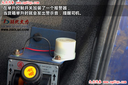 在這輛自卸車上,我們也看到了這樣的報警器,就安裝在貨箱舉升控制器上面,當(dāng)貨箱舉升時就會不停的發(fā)出報警音,當(dāng)貨箱放下后停止報警。