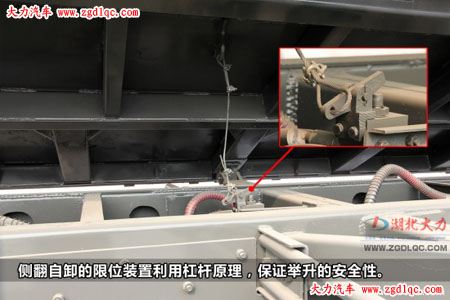 最后我們來看看側(cè)翻自卸的限位裝置,巧妙的利用了杠桿原理,當(dāng)貨箱翻轉(zhuǎn)到指定位置后,帶動鋼絲繩帶動圖中杠桿原理,啟動限位裝置,保證了舉升的安全性。