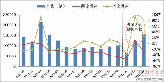 從第一季度各月份增長情況來看,與往年相比,一季度各月份比例存在著較大不同,其主要原因歸結(jié)如下:往年春節(jié)均在2月份,而今年的春節(jié)提前11天至1月,使得原本2月份產(chǎn)銷量均較低的情況提前至1月;元旦假期是另一個(gè)主要原因,1月工作日僅有17天,使得今年1月份的產(chǎn)量同比、環(huán)比增幅均呈現(xiàn)出較大幅度下降;相比之下,2月份由于工作日較往年多,同比、環(huán)比均呈現(xiàn)出較大幅度的增長。圖1為2011年以來專用汽車的月度走勢(shì)圖。