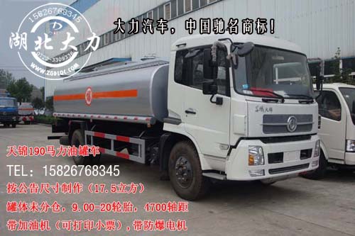車輛配置 采用東風(fēng)集團(tuán)原裝底盤(pán)生產(chǎn),排半可前翻駕駛室,大同6檔變速箱,4.5噸前橋9噸后橋,采用9.00-20尼龍?zhí)ヌゲ捎?50×80MM直通車架,配置康明斯190馬力發(fā)動(dòng)機(jī),發(fā)動(dòng)機(jī)型號(hào):B190 33. 豪華駕駛室,斷氣剎/排氣制動(dòng)/動(dòng)力轉(zhuǎn)向.配備標(biāo)準(zhǔn)加油機(jī)一臺(tái),帶15米卷盤(pán)和槍,配置專用油泵,具有快速的進(jìn)油或出油功能。隨車附帶2根罐體等長(zhǎng)的油管,2個(gè)滅火器,1個(gè)爬梯,兩側(cè)及后保險(xiǎn)杠,1根接地線。罐體最大容積17.5立方米(15噸柴油)。