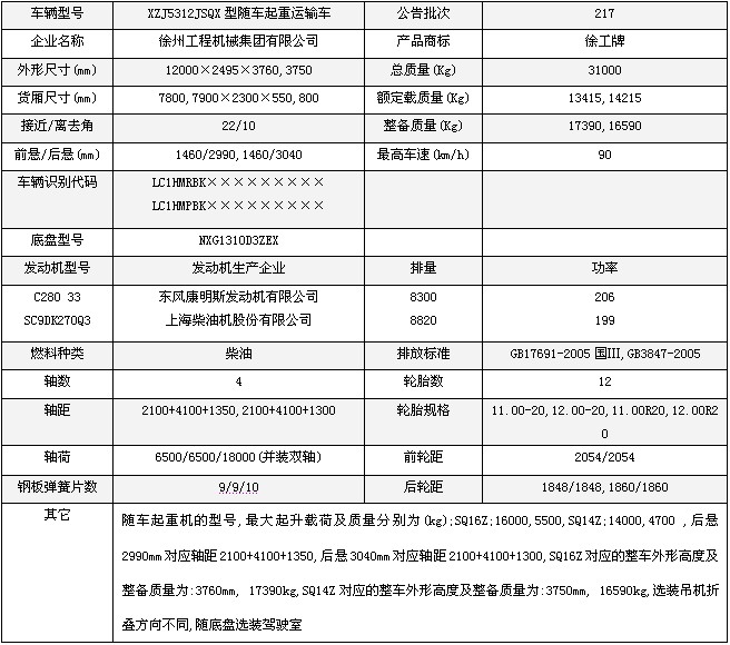 徐工前四后八隨車起重運(yùn)輸車  底盤型號(hào):NXG1310D3ZEX 額定質(zhì)量:13415,14215