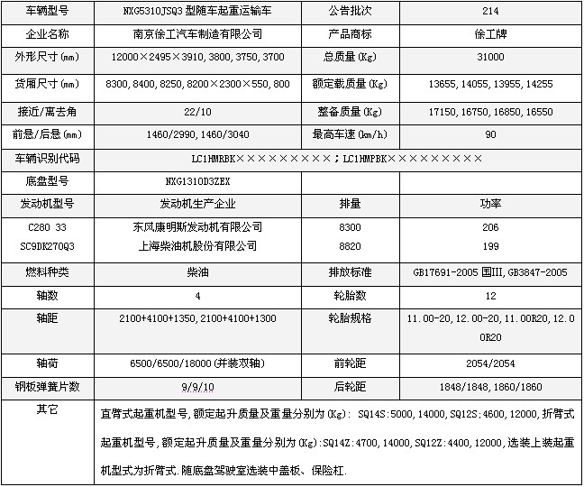 徐工前四后八隨車起重運(yùn)輸車  底盤型號(hào):NXG1310D3ZEX 額定質(zhì)量:13655,14055,13955,14255