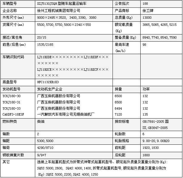 江淮隨車起重運(yùn)輸車  底盤型號(hào):HFC1132KR1K3 額定質(zhì)量:3865,5065,4265,5215