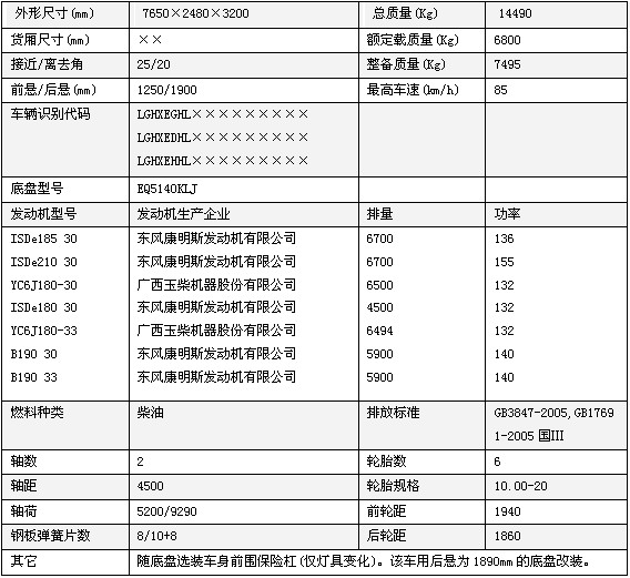 隨底盤選裝車身前圍保險杠(僅燈具變化)。該車用后懸為1890mm的底盤改裝。