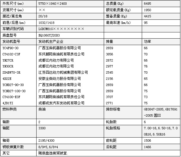 底盤:EQ1060TJ20D3,發(fā)動機:YC4F90-30 CY4102-C3F YN27CR YN30CR SD4BW70-3R 4D22E YCND27-90-30 YCND27-100-30