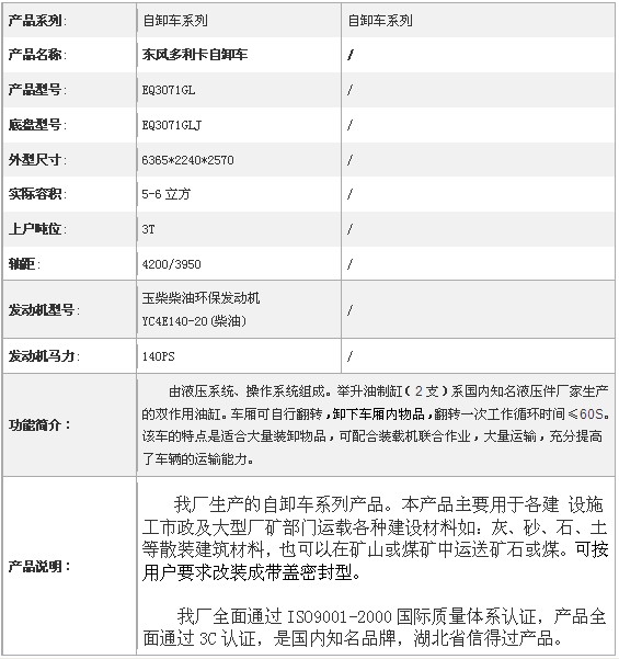 東風多利卡自卸汽車  底盤型號:EQ3071GLJ6 額定質量:2990,2940