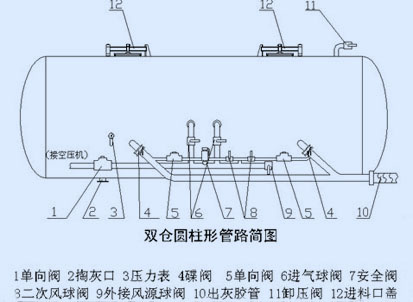5、罐體:密封的裝載物料容器。上方有人孔,走臺(tái),用于裝料及維修人員進(jìn)入罐內(nèi);下方有扶梯兼擋泥板及底架,底架用于連接罐體與汽車(chē)大梁。罐內(nèi)有隔開(kāi)的空氣室,氣室由滑板、多孔板及特制帆布組成,以便空氣與粉粒體混合并形成流態(tài)狀。