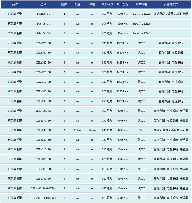 東風(fēng)康明斯發(fā)動機部分型號圖表